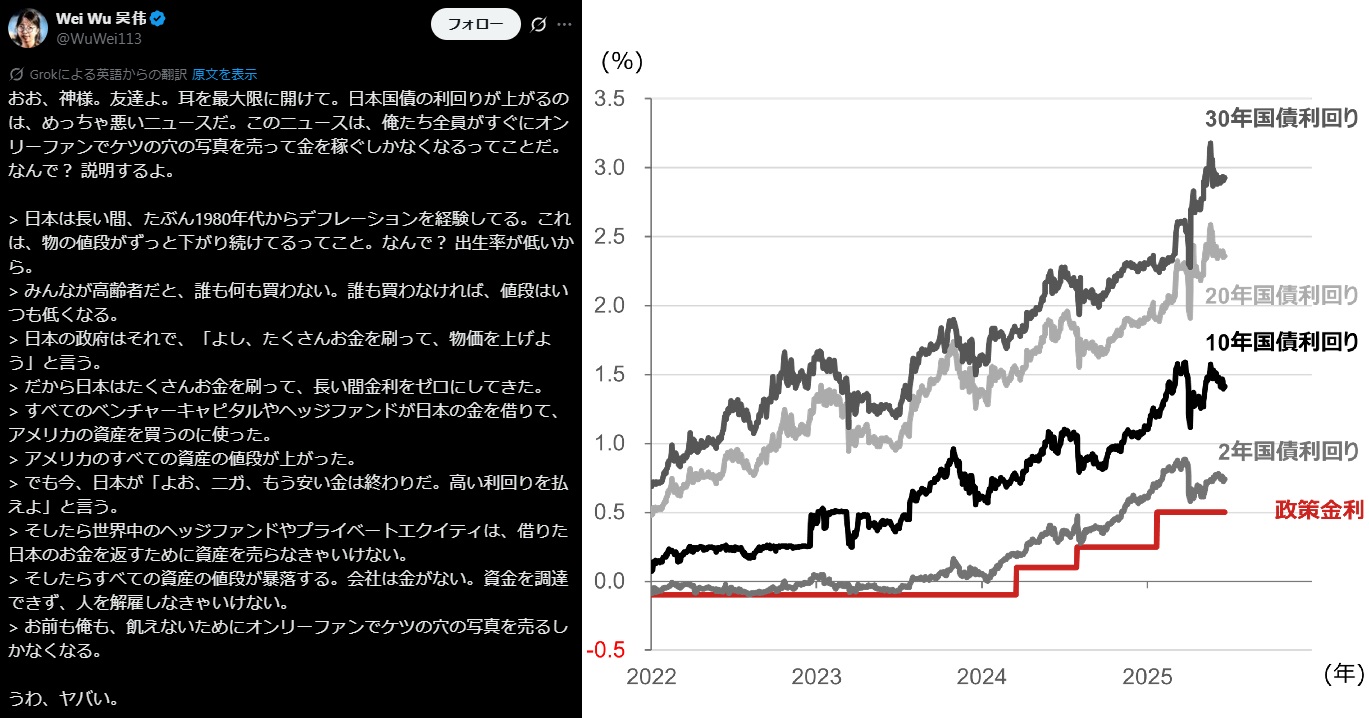 その投稿は、日本の国債利回りが上昇すると、世界経済にどのような影響が及ぶのかを、非常にユニークな表現で解説したものでした。