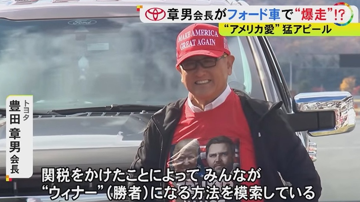 トヨタ自動車の豊田章男会長が、「Make America Great Again」と書かれた赤い帽子と、トランプ氏とヴァンス氏の顔がプリントされたTシャツを着用して登場したのです。
